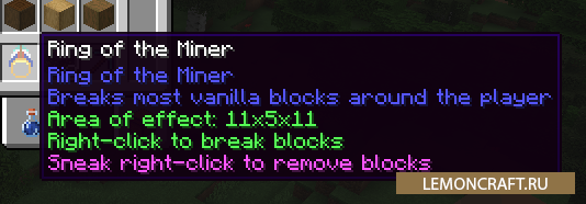 Мод на кольцо шахтера Ring of the Miner добавит в игру особое кольцо с помощью которого вы сможете быстро разрушать блоки, которые не содержат руд. Разрушать вы будете блоки в направлении вашего взора на площади 11х5х11 блоков. При одновременном нажатии Shift+ПКМ, блоки не разрушаются, а просто исчезают. С этим модом вы станете настоящим разрушителем.